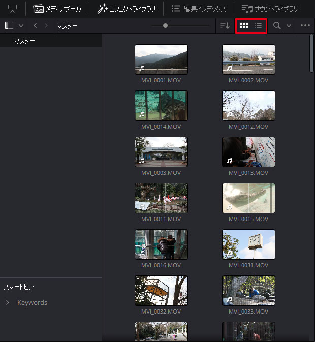 画像赤枠をクリックしてメディアプールの表示方法をサムネイル表示に変更します。左がサムネイル表示、右がリスト表示です。上の画像はサムネイル表示になっているものです。
