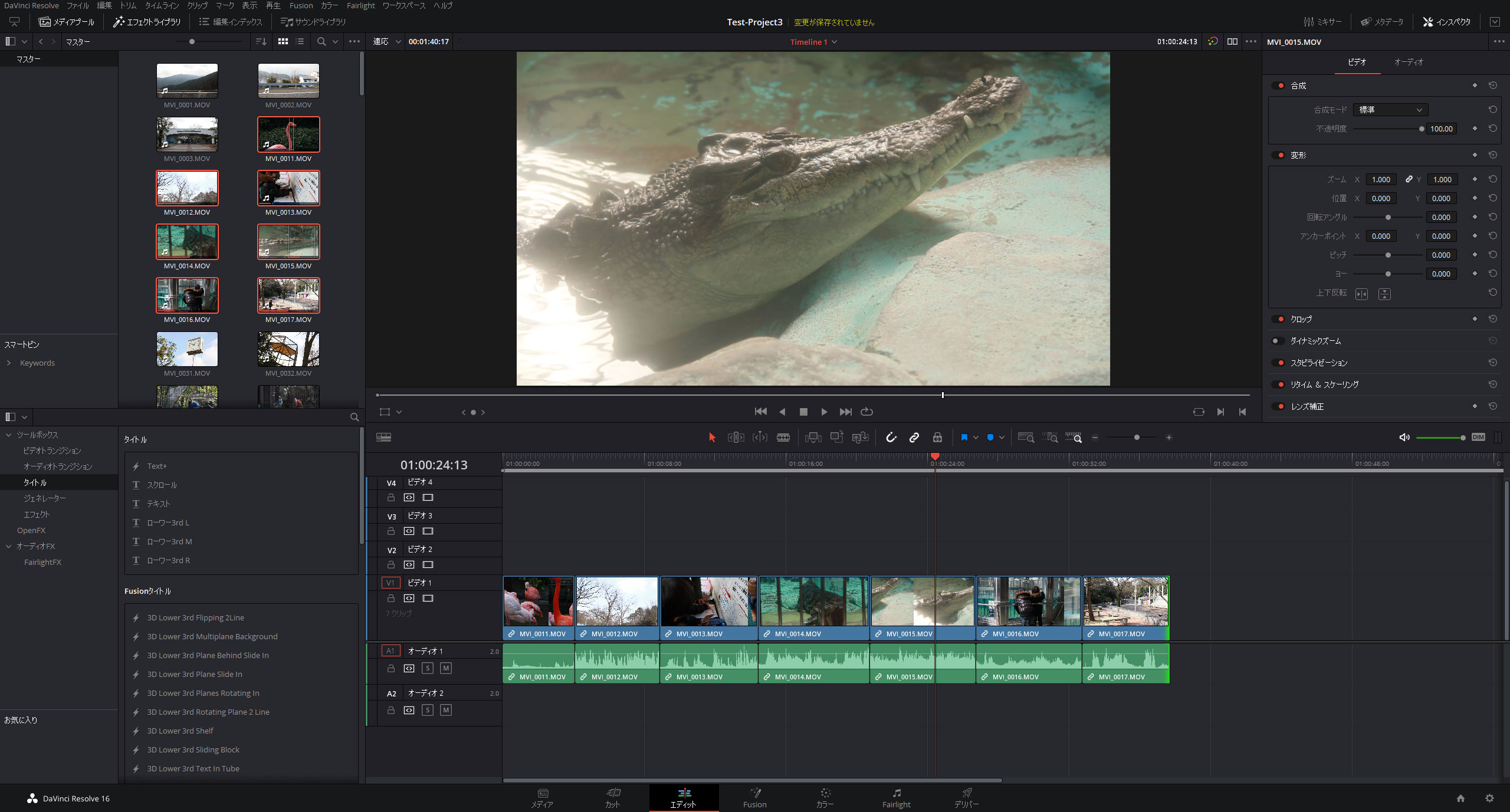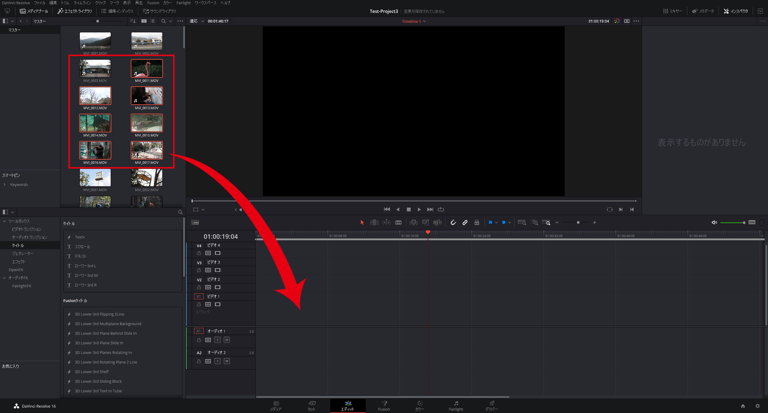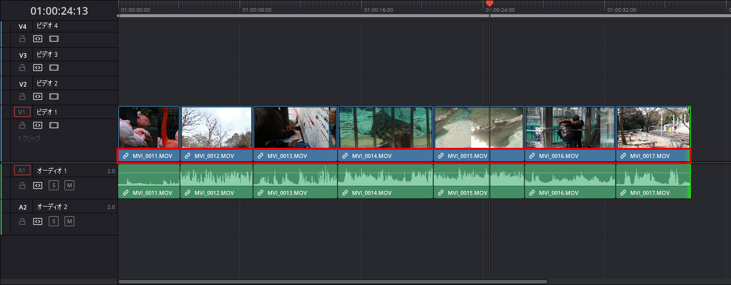メディアプールでファイル名順に並び替えた動画素材をタイムラインにまとめて読込んでみましょう。
