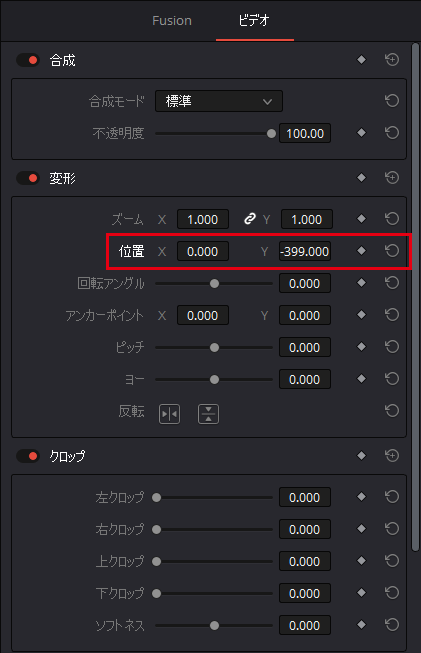 ビデオパネル内の位置の項目を調整してテロップの位置を調整します。好きな場所に配置してください。ここでは、Yをマイナスにして定番の画面下にテロップを配置します。Xが横方向の移動になります。