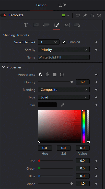 配置した Text+ を選択した状態で、エディットページ右上の【インスペクタ】を選択してください。【インスペクタ】に表示されているビデオパネルを開きます。