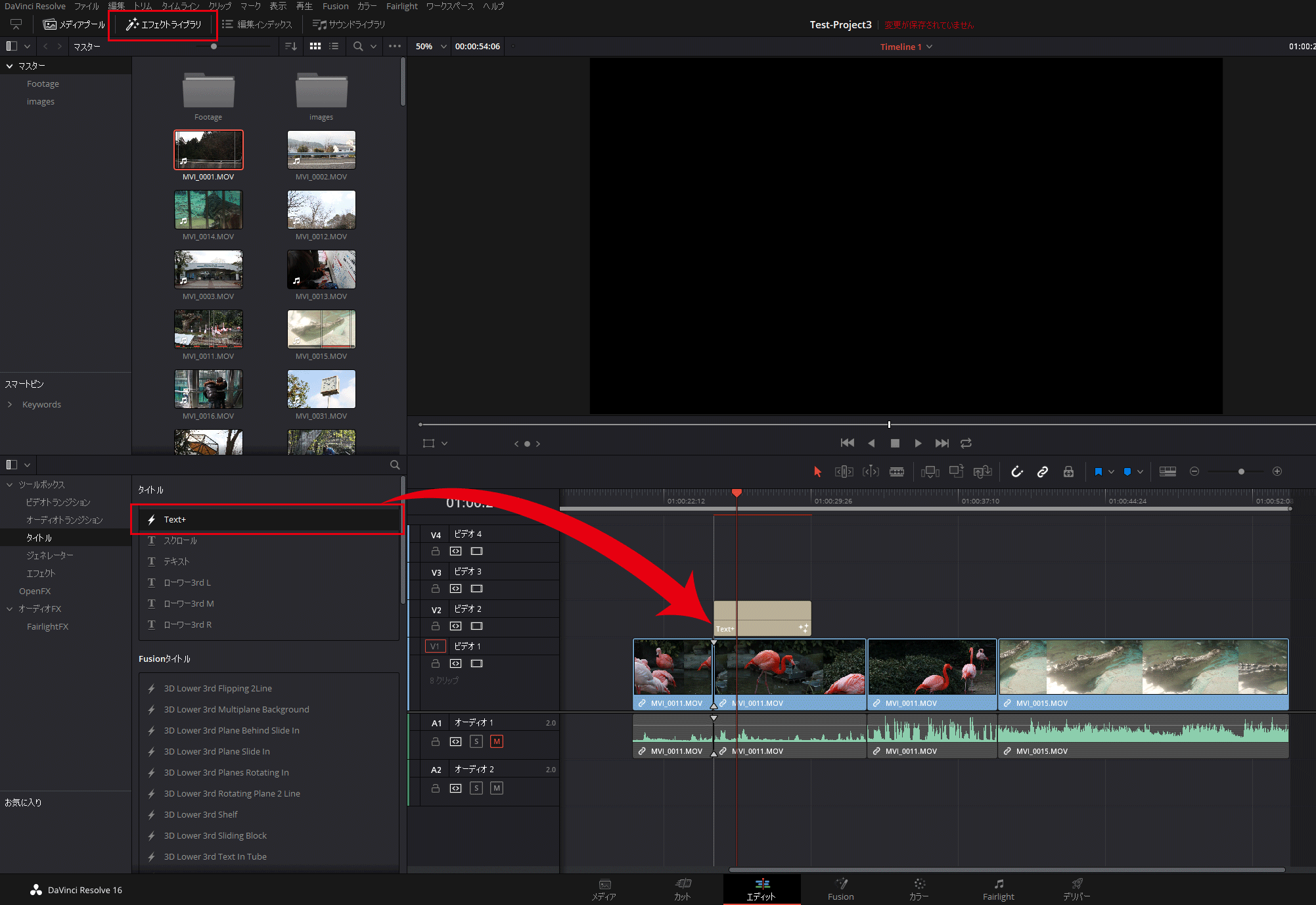 エフェクトライブラリのタイトルから Text+ をタイムラインへ配置します。ドラッグ&ドロップでOK。