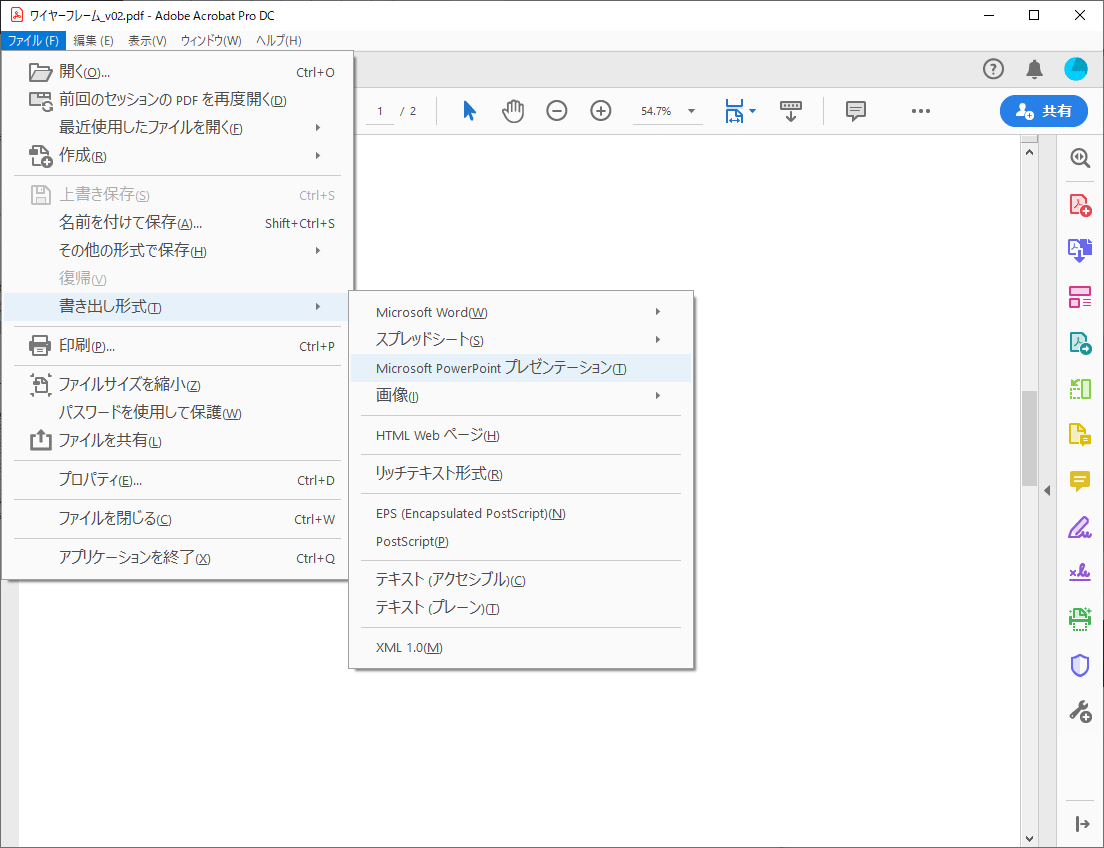 次にPDFを開いた状態で Adobe Acrobat のファイルメニューから「書き出し形式」→「Microsoft PowerPoint プレゼンテーション」をクリックします。