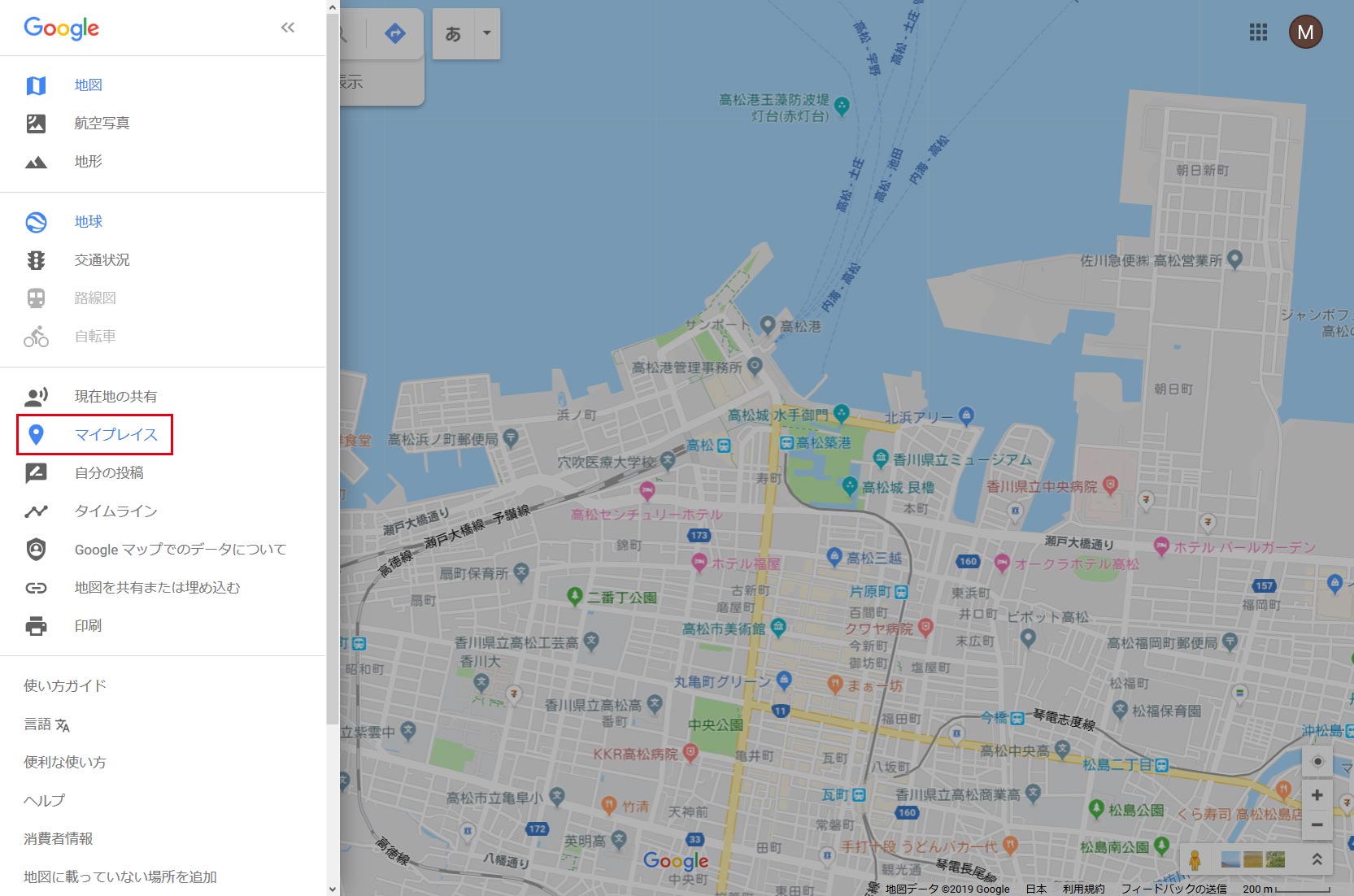 マイプレイスから「マイマップ」タブをクリックし、メニュー下部の「地図を作成」をクリックします。