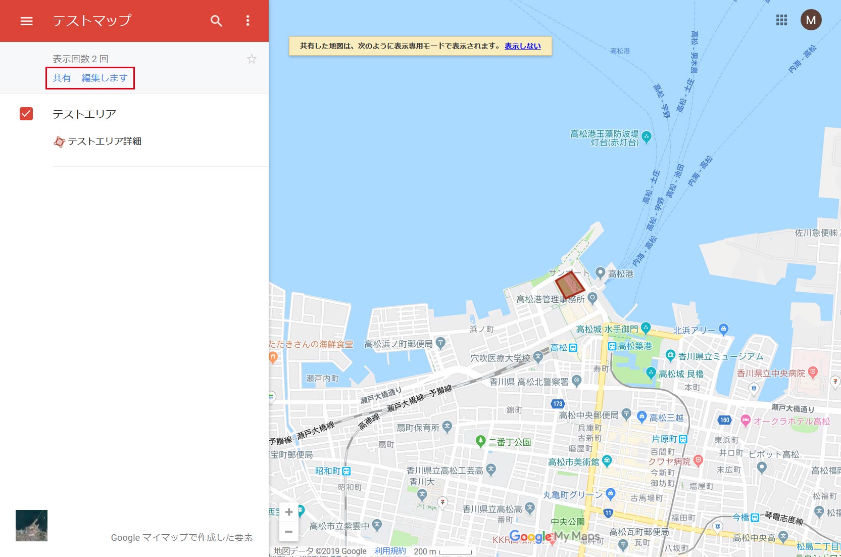 作成した地図を確認して問題がなければ、赤枠内の「共有」をクリック。編集が必要な場合は、「編集します」をクリックして下さい。
